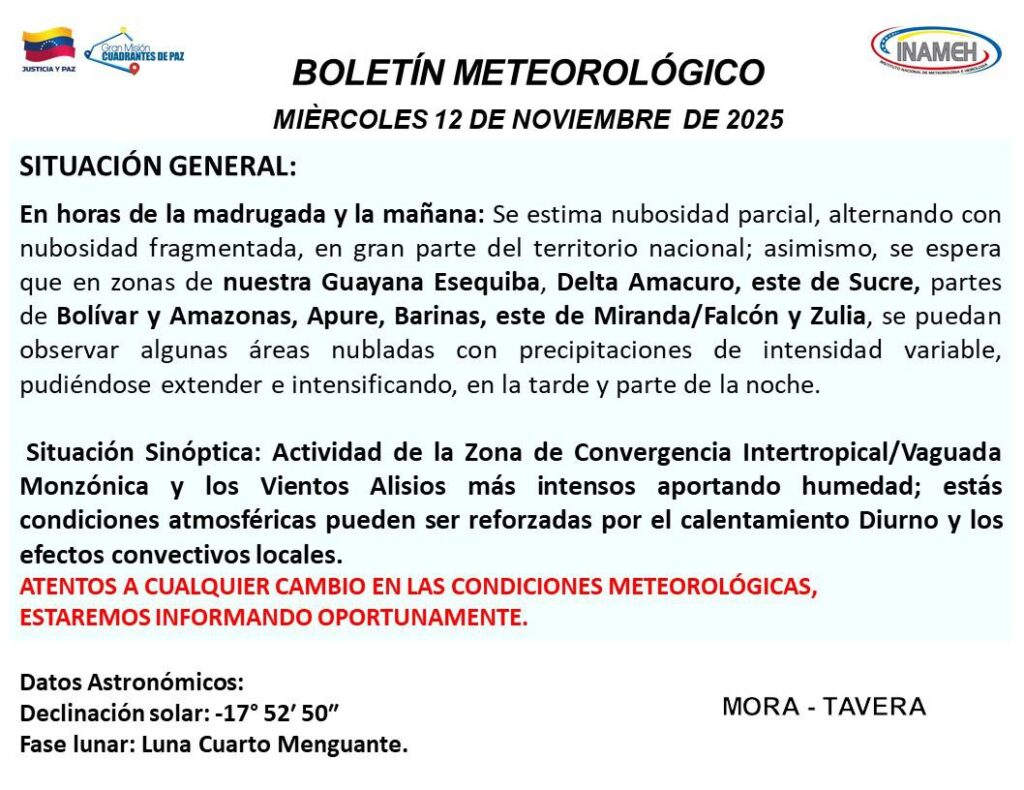 El Instituto Nacional de Meteorología e Hidrología (Inameh) informa el estado del tiempo, tenemos el pronóstico para este miércoles 12 de los corrientes. Continúan las condiciones meteorológicas estables en buena parte del territorio nacional.