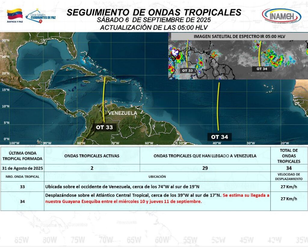 En este sentido, indica que la onda tropical Nº 33 mantiene su «desplazamiento del centro al occidente de Venezuela, interactuando con la zona de convergencia intertropical».