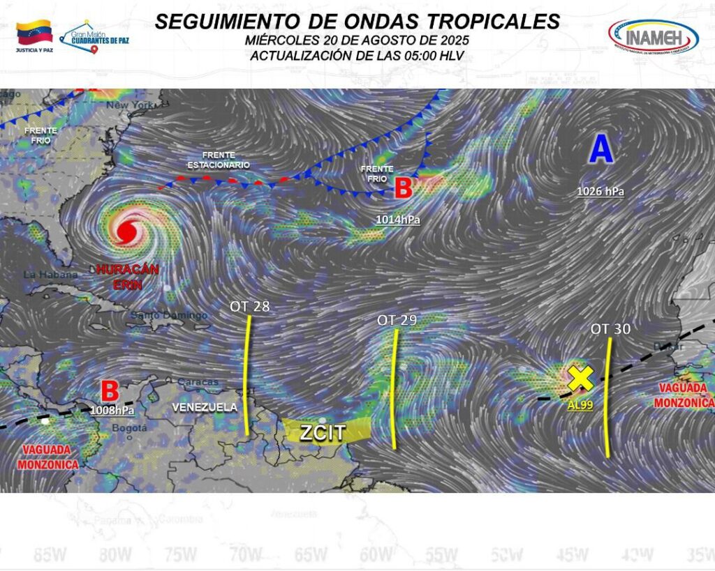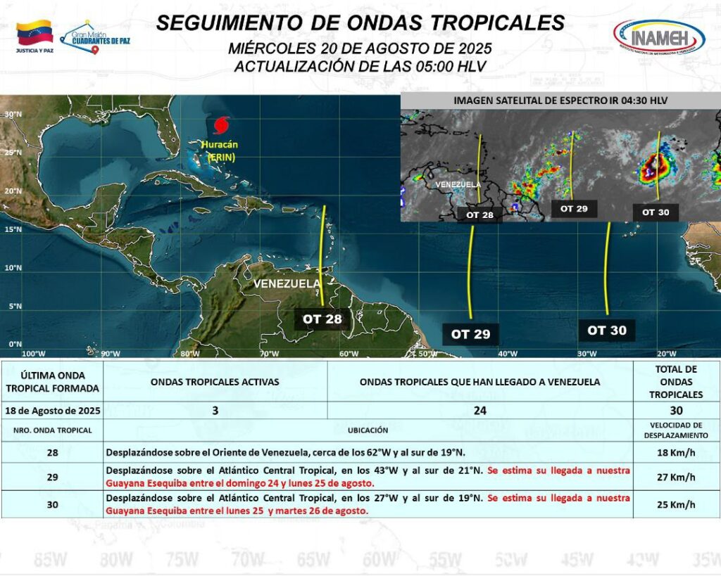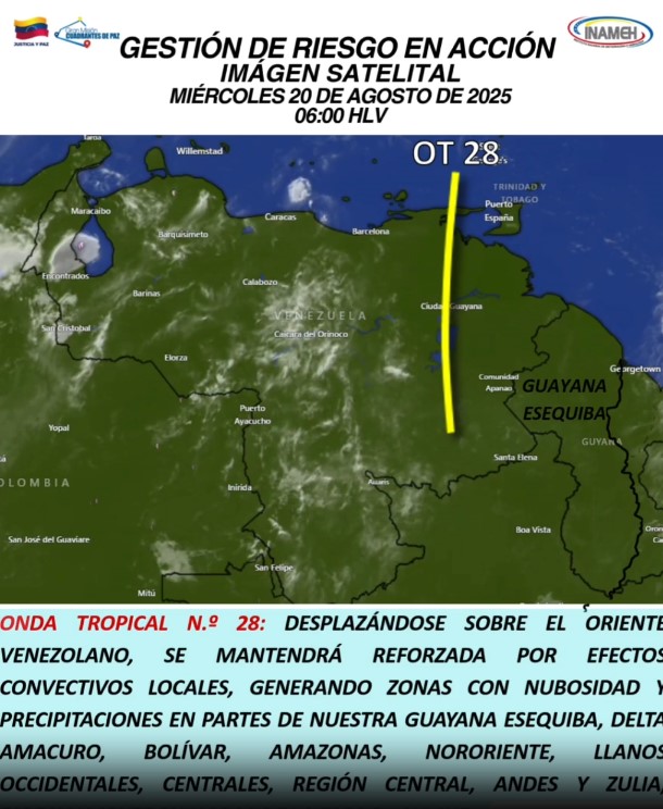 Continúa el monitoreo constante por parte de las autoridades del Instituto de Meteorología e Hidrología (Inameh), ante el paso de las ondas tropicales y que afectan al territorio nacional, esta a su paso la onda tropical número 28 generando nubosidad y precipitaciones en varios estados del pais.