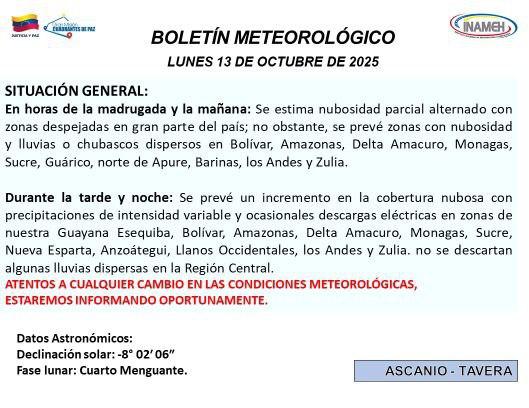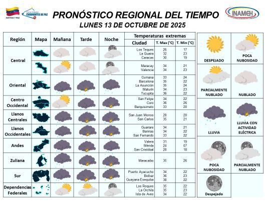 El Instituto Nacional de Meteorología e Hidrología (Inameh) informa el estado del tiempo, tenemos el pronóstico para este lunes 13 de los corrientes. Continúan las condiciones meteorológicas estables en buena parte del territorio nacional.