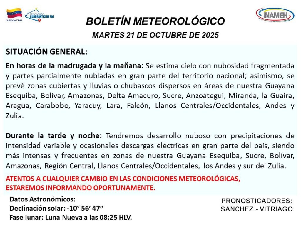 El Instituto Nacional de Meteorología e Hidrología (Inameh) informa el estado del tiempo, tenemos el pronóstico para este martes 21 de los corrientes. Continúan las condiciones meteorológicas estables en buena parte del territorio nacional.